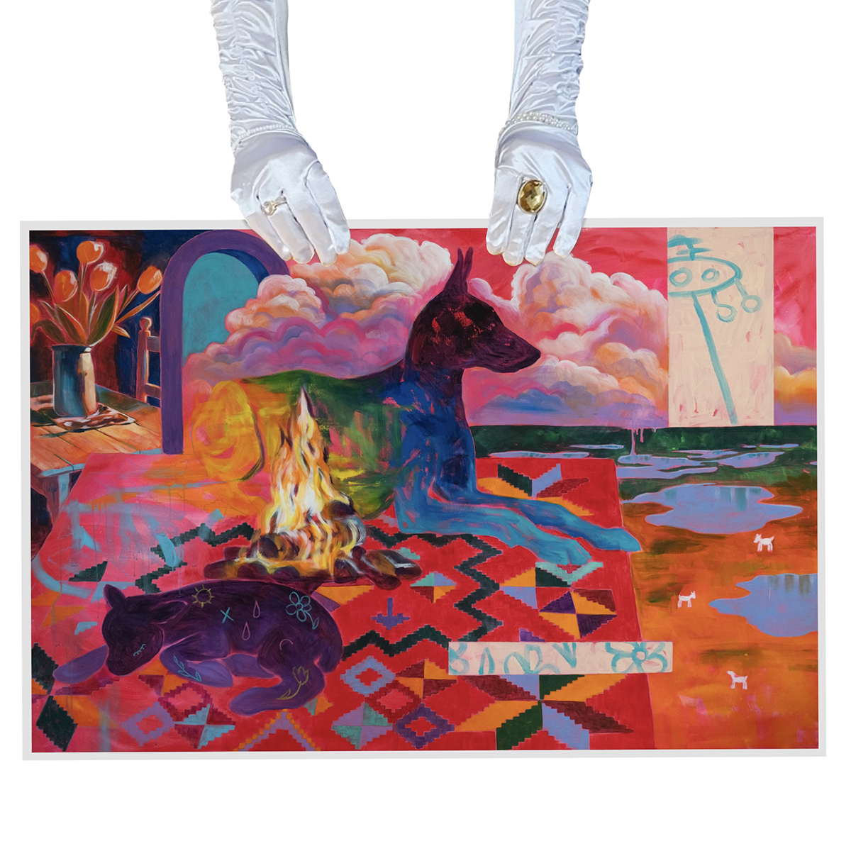 What happens when you start showing all sides of yourself? What colorful world will look back at you? In this piece, Liisa Addi reflects her colorful inner world, vivid thoughts, and soft dreams. A carpet woven at the end of the 19th century has created the foundation for Liisa’s colorful world to gain more confidence, showing that this world needs more color and diversity. The Alter Ego protects the Black Sheep and tends the fire so that it never goes out. Cosmic dreams and the feeling of being like an alien on this planet give hope for a gentle and considerate future. We can start over as many times as needed: it’s important to rest, take time, but keep your eyes on the horizon.